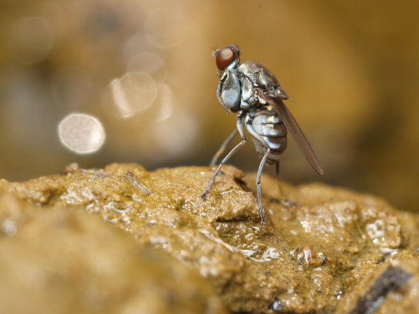 水辺に棲息していながら、意外や彼らは水面を苦手とする。水面上を歩くのはヘタで、それはまるで飛行艇が浮いている状況にも似ているだろう。飛行艇はプロペラの起こす風力と羽根の揚力によって移動し、水面から飛び立つことができるが、水面上をあちこちと自由自在に移動することは苦手だ。ミナミカマバエもうまく歩けないので、翅のはばたきでなんとか移動して、近くの石や枯れ葉の島へと上陸するのである。