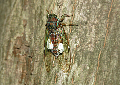 月夜のこともありオニグモの姿はくっきりと夜空に浮かび上がる。 でっぷりとしたオニグモの体型は、まさにクモの王者とでも言えようか! オニグモがこうして毎晩、網をかけるということは、それなりに獲物がこの庭の空間を通過するのであろうか? どれどれ、どんな獲物が掛かるのかい?少し好奇心もあって、網が完成したころを見計らって、ほろ酔いかげんで覗きにいってみた。 すると、おお!トンボの一種をすでに押さえ込んでいるではないか(写真下)!