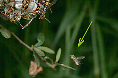 | 私の実家は愛媛県松山市にある。 夕方になると、その庭の隅で大きな円網がゆったりと風にたなびく。 直径は60センチもあろうか、屋根の廂と庭の畑に突き立てた園芸用支柱を足場にしたオニグモの巣網が登場する(写真上、8/27撮影)。