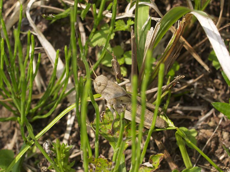 すると足下から次々とトノサマバッタの幼虫たちが跳ねていく。しかし、次の瞬間には姿が見えなくなる(写真上、中:褐色型)。彼らはじっとしていることが、一番安全であることをよく知っているのだろう。とはいえ、私の歩く地響きにはじっとしておられないようだ。 体の大きさはまだ1センチ程度。せいぜい2令か3令といったところだろうか(写真下)。