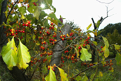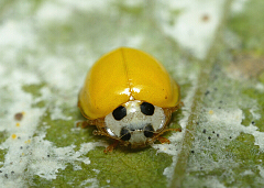10/25から注目してきた3頭のゴマダラチョウ幼虫たち。1週間目にして体色の変化はない。ところが今朝、この3頭のすぐ側であらたに2頭見つかった。迂闊にも見落としであったようだ!そのうち1頭は、御覧のごとく葉っぱの黄色に溶け込むまでになっている。こうした体色の変化は葉っぱの上にいる段階で進行するものが多く、大抵は完全に茶色へと移行してから落ち葉へ降りる。けれど落ち葉の下に降りてもなお緑色のままの、のんびりタイプもいないわけではなく、私は2例を見ている。のんびり屋というより、さっさと急いで降りたせっかちタイプであるのかもしれないが。