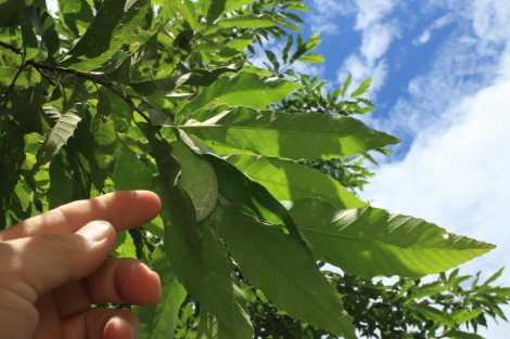 さて、先週24日にクヌギの梢を歩いていたヤママユ幼虫。どこに繭を作ったかと探してみれば、すぐに見つかった。