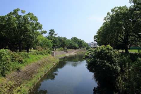 都城市の中心街にある「神柱公園(かんばしら)」。公園の中央には東西に流れる川がある。川面を撫でるかのようにギンヤンマの♂が一直線に飛んでいる。